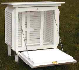 A Stevenson Screen is a white boxed shelter that contains temperature and relative humidity equipment. It shields the instruments from sunshine and precipitations and has louvered sides to permit the free movement of air. The shelter is placed over grass, mounted 1 meter above the ground and as far from buildings as circumstances permit.