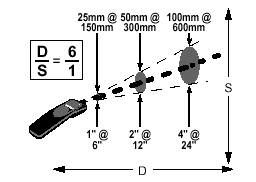 Distance-to-spot size ratio is the relationship between the distance of the measuring device from the surface and the portion of the surface being measured. This ratio varies from unit to unit. The following example applies to a unit with a distance-to-spot size ratio of 6:1.