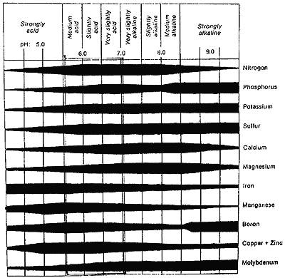 The amount of various elements present in the soil depends on the nature of the soil and on its organic matter content since it is a source of several nutrient elements. Soil nutrients exist both as complex, insoluble compounds and as simple forms usually soluble in soil water and readily available to plants. The complex forms must be broken down through decomposition to the simpler and more available forms in order to benefit the plant. These available forms are summarized in Table A. The pH value is a measure of acidity or alkalinity. The effect of pH on availability of essential elements is shown below.